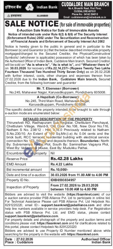 Thirunelveli RD, Radhapuram Sub-Registar, Chettiulam Panchayat, Chettiulam Village, Ward-9, Old Door No. 108, New Door No.116, Natham S No. 238/12 Hec 0.16.0 Previously related to Natham S.No. 230/10. An Extent of 160 Sq.Mtr.(i.e) Ac 0.04 cents and the brick built, RCC terraced residential building with electrical service connection No 173, fittings and deposits thereon. Boundaries: North By: Subramaniya Nadar Plot, South By: Saminathan Vagayra Piot, West By: Valliammal House, East By: Mudukku Pathai.