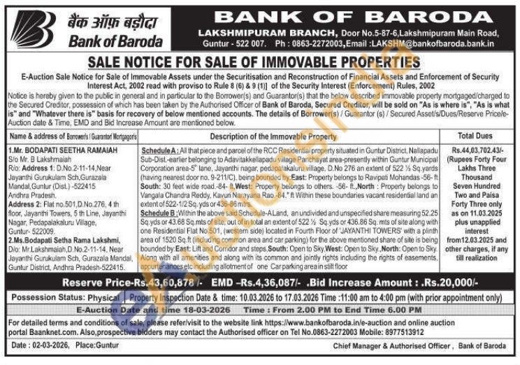 Schedule A: All that piece and parcel of the RCC Residential property situated in Guntur District, Nallapadu Sub-Dist.-earlier belonging to Adavitakkellapadu village Panchayat area-presently within Guntur Municipal Corporation area-5" lane, Jayanthi nagar, pedapalakaluru village. D.No 276 an extent of 522 % Sq yards (having nearest door no. 9-211/C), being bounded by:East: Property belongs to Ravipati Mohandas-56-ft South: 30 feet wide road.-84- ft, West: Property belongs to others. -56-ft, North Property belongs to Vangala Chandra Reddy, Kavuri Narayana Rao.-84." It Within these boundaries vacant residential land an extent of 522-1/2 Sq. yds or 436-86 mtrs. Schedule B:Within the above said Schedule-ALand, anundivided and unspecified share measuring 52.25 Sq.yds or 43.68 Sq.mts of site, out of in total an extent of 522 % Sq.yds or 436.86 Sq. mts of site along with one Residential Flat No.501, (western sidej located in Fourth Floor of "JAYANTHI TOWERS' with a plinth area of 1520 Sq.ft (including common area and car parking) for the above mentioned share of site is being bounded by East: Lift and Corridor and steps, South: Open to Sky West: Open to Sky, North: Open to Sky Along with all amenities and along with its common and jointly rights including the rights of easements, appurtenances etc including allotment of one Carparking area in still floor