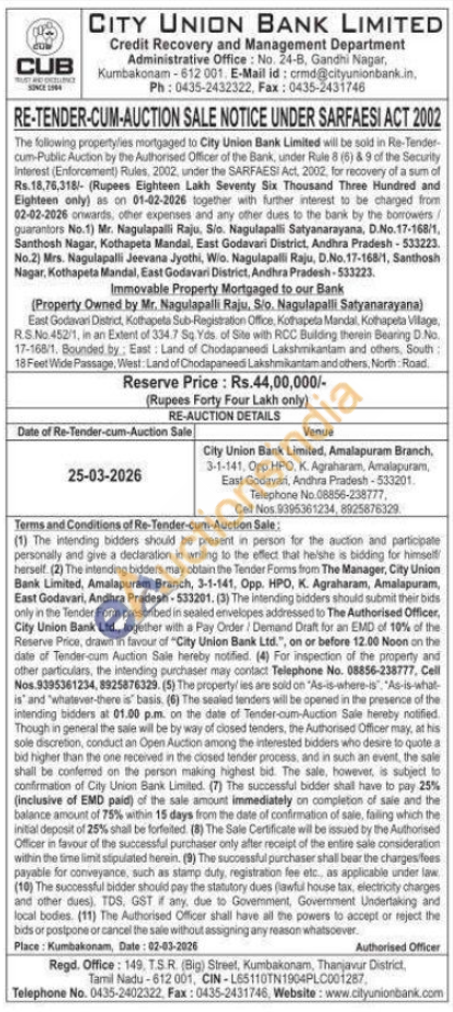 East Godavari District, Kothapeta Sub-Registration Office, Kothapeta Mandal, Kothapeta Village, R.S.No 452/1, in an Extent of 334.7 Sq. Yds of Site with RCC Building therein Bearing D.No. 17-168/1. Bounded by: East: Land of Chodapaneedi Lakshmikantam and others, South 18 Feet Wide Passage, West: Land of Chodapaneedi Lakshmikantam and others, North Road