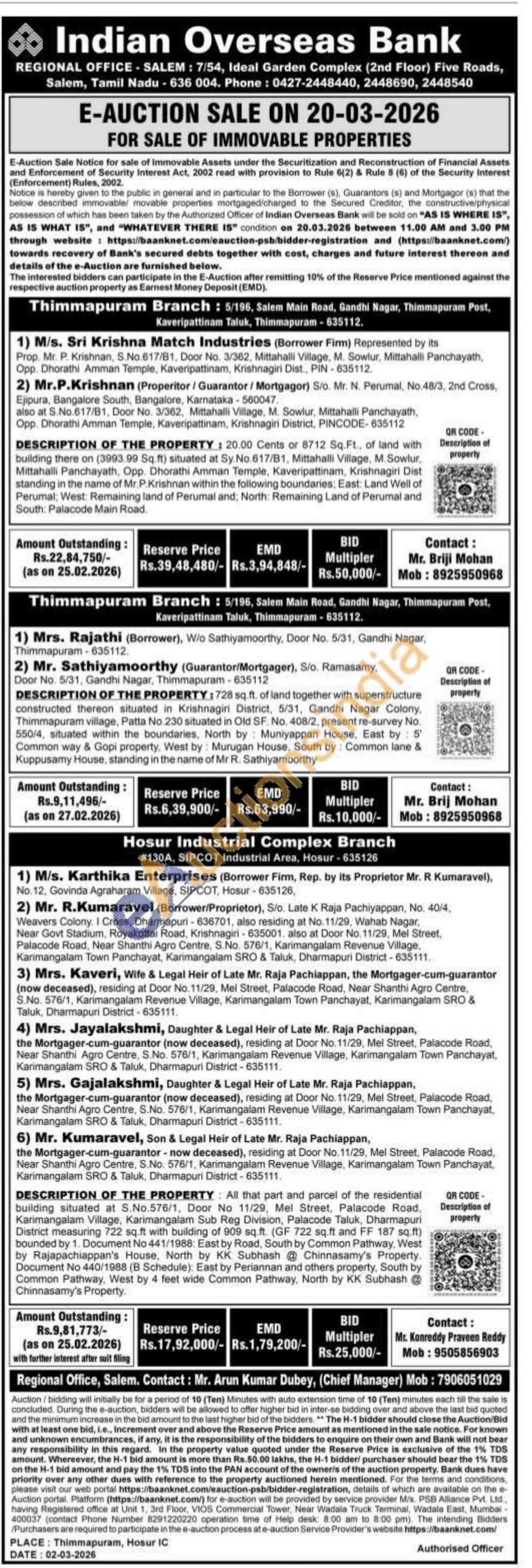 DESCRIPTION OF THE PROPERTY: All that part and parcel of the residential building situated at S.No.576/1, Door No 11/29, Mel Street, Palacode Road, Karimangalam Village, Karimangalam Sub Reg Division, Palacode Taluk, Dharmapuri District measuring 722 sq.ft with building of 909 sq.ft. (GF 722 sq.ft and FF 187 sq.ft) bounded by 1. Document No 441/1988: East by Road, South by Common Pathway, West by Rajapachiappan's House, North by KK Subhash @ Chinnasamy's Property. Document No 440/1988 (B Schedule): East by Periannan and others property, South by Common Pathway. West by 4 feet wide Common Pathway, North by KK Subhash@ Chinnasamy's Property
