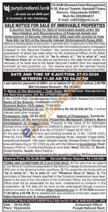 Description of the immovable Properties Mortgaged/ Owner's Name (mortgagers of property(ies)): Property in the name of Sri Adimulam Ramakrishna Vide Sale Deed no 2349/2011 dated 22.07.2011 & 1789/2014 dated 30.11.2010 & MOD Doc No. 1372/2017 Dated 29-07-2017. All the part and piece of land and building located at D No 13/338-1A(9), Plots No. 14 & 15. Sy No. 496, Gandlanagaraju thota, Vempalli Village fields, vempalli panchayath, 13th ward, vempalli mandal, Kadapa Disrtict, Residential area admeasuring to 160, 2524 sq.yds with the following boundaries: East: House in Plot no. 13 of Konda Reddy & Joint Wall, West: Plot No. 16. North: Street Rastha, South: Main Rastha