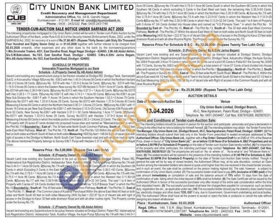 Vacant Land now existing any Superstructure to be put up thereon situated at Dindigul District, Palani RD. Vadamadurai Sub Registration District, Vedasandur Taluk, Kulathur Village, The Ayan Punja 1) Survey No. 7/6 with Hec 0.44.0-1 Acre 09 Cents 2)Survey No. 7/4 with Hec 0.79.5-1 Acre 96 Cents South in which the Southem 98 Cents in which Excluding 5 Certts in the East West Cart Track, the remaining Hec 0.38.0=93 Cents. 3)Survey No 7/4 with Hec 0.79.51 Acre 96 Cents in which the Northern Hec 0.39.5-98 Cents. 4)Survey No.7/5 with Hec 0.75.51 Acre 86 Cents 5) Survey No.73 A with Hec 0.23.0-57 Cents in which the Westem Hec 0.11.80-29 Cents. 6) Survey No. 7/7 with Hec 0.39.5-98 Cents in which Hec 0.13.5-32 3/4 Cents. The said 1 to 6 item of Property with 5 acres 47 3/4 Cents divided into house sites and named as "V.G PBreeze Town" in which the Plot No. 10 Bounded by: South of The 30 feet wide East West Common Pathway, North of The Plot No.31. East of The Plot No. 11, West of The Common place of Kulathur Panchayat Within the above East West 40 feet on both sides and North South 60 feet on both sides Measuring 2400 Sq feet 222.97 Sq.m of Vacant site with right of access in the Dindigul to Kanir 30 feet wide diversion Road and with all other routine rights. The Property comes under the Survey No. 7/5. Schedule C (Property Owned By AB. Abdul Akhim) Vacant land existing any Superstructure to be putup thereon situated at Dindigul District, Palani RD, Vadamadurai subi Registration District, Vedasandur Taluk, Kulathur Village, the Ayan Punja 1)Survey No. 7/6 with Hec 0.44.0-1 Acre 09 Cents. 2)Survey No.714 with Hec 0.79.5-1 Acre 96 Cents South in which the Southern 98 Cents in which the Southern 98 Cents in which excluding 5 Cents in the East West cart track, the remaining Hec 0.38.0x93 Cents. 3)Survey No.714 with Hec 0.79.5-1 Acre 96 Cents in which the Northem Hec 0.39.5-98 Cents. 4) Survey No.775 with Hec 0.75.5-1 Acre 86 Cents. 5) Survey No 7/3 A with Hec 0.23.0-57 Cents in which the Westen Hec 0.11.8.0-29 Cents 6)Survey No 7/7 with Hec 0.39.5-98 Cents in which Hec 0.13.5-32 3/4 Cents. The said 1 to 6 item of Property with 5 Acres 47 314 Cents divided into House sites and named as "VG.Ptreeze Town in which the Plot No: 14 Bounded by East of-The Plot No. 15, West of The Plot No. 13, South of The 30 feet wide East West Common Pathway, North of The Plot No.27 Within the above East West 40 feet on both sides and North South 60 feet on both sides Measuring 2400 Sq feet 222.97 Sq m of Vacant Site with Rights of access in the Dindigul to Karur 23 feet wide diversion Road and with all other Routine Rights. The Property comes under the Survey No.7/5