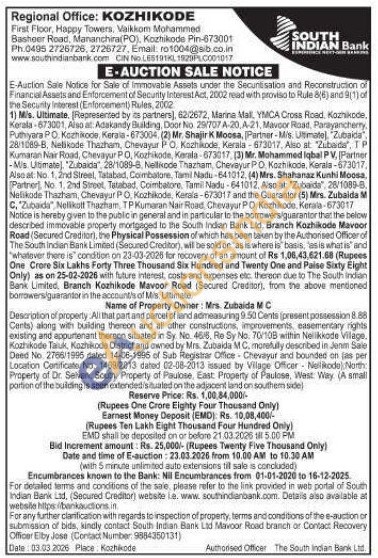 Description of property All that part and parcel of land admeasuring 9.50 Cents (pressent possession 8.88 Cents) along with building thereon and all other constructions, improvements, easementary rights existing and apputenant thereon situated in Sy No. 4616, Re Sy No. 70/108 within Nelikkode Village, Kozhikode Taluk, Kozhikode District and owned by Mrs. Zubaida MC, morefully described in Jenim Sale Deed No 2766/1995 dated 14-06-1995 of Sub Registrar Office Chevayur and bounded on (as per Location Certificate No. 1409/2013 dated 02-08-2013 issued by Vilage Officer-Nellikode) North Property of Dr. Selvan. South: Property of Paulose. East: Property of Paulose, West Way (A small partion of the building is seen extended/situated on the adjacent land on southem side