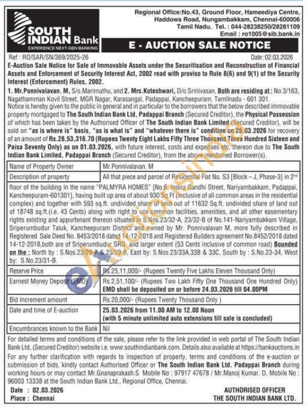 All that piece and parcel of Residential Flat No. S3 [Block-J, Phase-3] in 2 floor of the building in the name "PALMYRA HOMES" [No.6, Indira Gandhi Street, Nariyambakkam, Padappai, Kancheepuram-601301), having built up area of about 930 Sq. Ft (inclusive of all common areas in the residential complex) and together with 593 sq.ft. undivided share of land out of 11632 Sq.ft. undivided share of land out of 18748 sq.ft. (i.e. 43 Cents) along with right to use common facilities, amenities, and all other easementary rights existing and appurtenant thereon situated in S.Nos. 23/32-A, 23/32-B of No.141-Nariyambakkam Village, Sriperumbudur Taluk, Kancheepuram District and owned by Mr. Ponnivalavan M. more fully described in Registered Sale Deed No. 8453/2018 dated 14-12-2018 and Registered Builders agreement No.8452/2018 dated 14-12-2018,both are of Sriperumbudur SRO and larger extent (53 Cents inclusive of common road) Bounded on the North by: S.Nos.23/29-A & 23/29-8, East by: S.Nos.23/33A 33B & 33C, South by: S.No.23-34, West by: S.No.23/31-B.