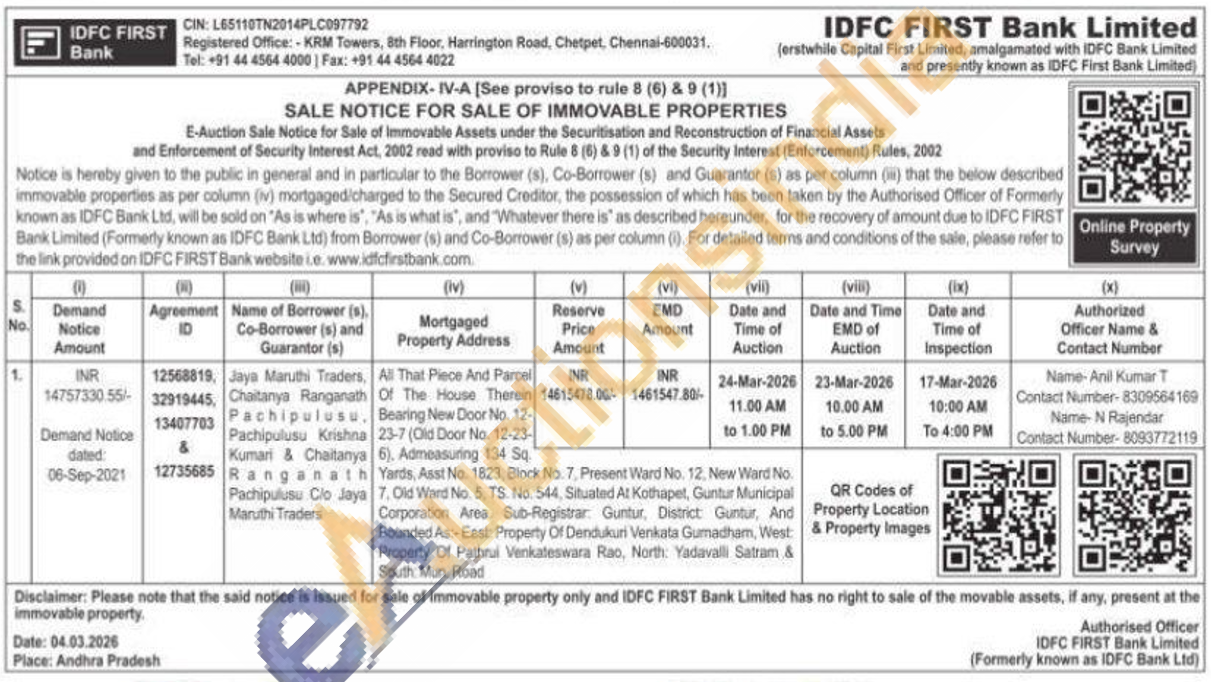 All That Piece And Parcel Of The House Therein Bearing New Door No. 12-23-7 (Old Door No. 12-23-6). Admeasuring 134 Sq Yards, Asst No. 1823, Block No. 7, Present Ward No. 12, New Ward No. 7. Old Ward No. 5, TS. No. 544, Situated At Kothapet, Guntur Municipal Corporation Area, Sub-Registrar: Guntur, District Guntur, And Bounded As:-East: Property Of Dendukuri Venkata Gumadham, West: Property Of Pathrui Venkateswara Rao, North: Yadavalli Satram & South Mun. Road