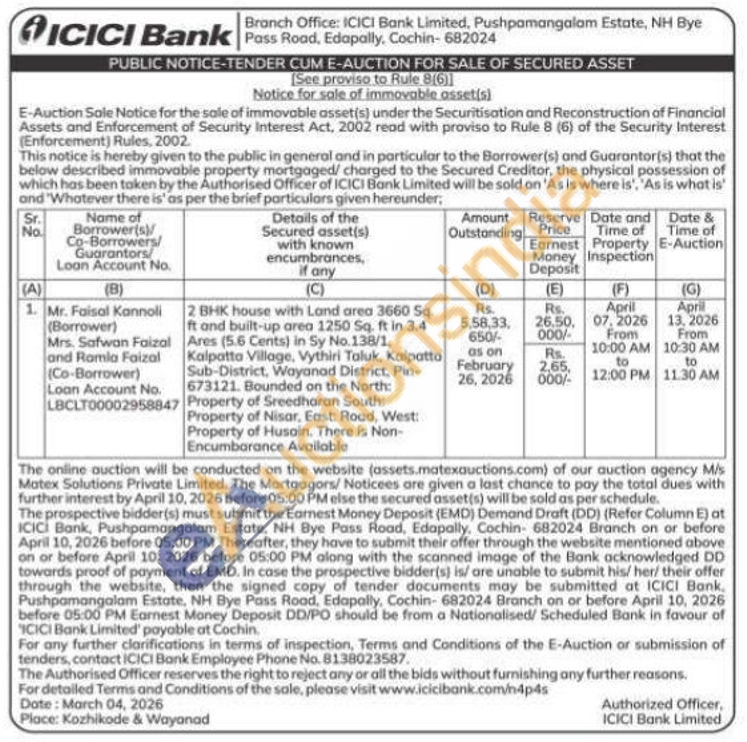 2 BHK house with Land area 3660 Sq. ft and built-up area 1250 Sq. ft in 3.4 Ares (5.6 Cents) in Sy No.138/1, Kalpatta Village, Vythiri Taluk, Kalpatta Sub-District, Wayanad District, Pin-673121. Bounded on the North: Property of Sreedharan South: Property of Nisar, East: Road, West: Property of Husain. There is Non-Encumbarance Available