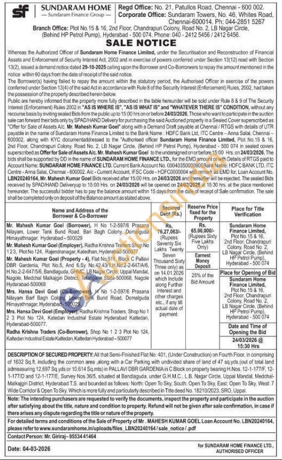 All that Semi-Finished Flat No: 401, (Under Construction) on Fourth Floor, in comprising of 1632 Sq.ft, including the common area along with a Car Parking with undivided share of land of 47 sq.yds. (out of total land admeasuring 12,697 Sq.yds or 10.614 Sq.mts) in PALLAVI DBR GARDENIA in C Block on property bearing H.Nos. 12-1-177/F, 12-1-177/D and 12-1-177/E, Survey Nos.36/5, situated at Bandiaguda, under G.H.M.C. LB. Nagar Circle, Uppal Mandal, Medchal-Malkajgiri District, Hyderabad T.S. and bounded as follows: North: Open To Sky, South: Open To Sky, East: Open To Sky, West: 7 Wide Corridor & Open To Sky. Which is more fully and particularly described in Title deed No. 18210/2023, SRO, Uppal