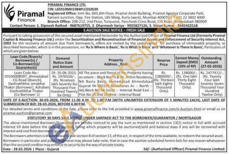 All The piece and Parcel of the Property having an extent:-Block No-75 & 76, Arthm Residency, NA Bavla Bavla Ahmedabad Ahmedabad Gujarat IN 382220 Boundaries As North Adj.Block.No-54 South: Internal Road East Plot. No-15 And 16 West: Internal Road