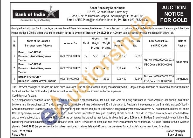 Bank of India Gold Auctions Auction in Pune