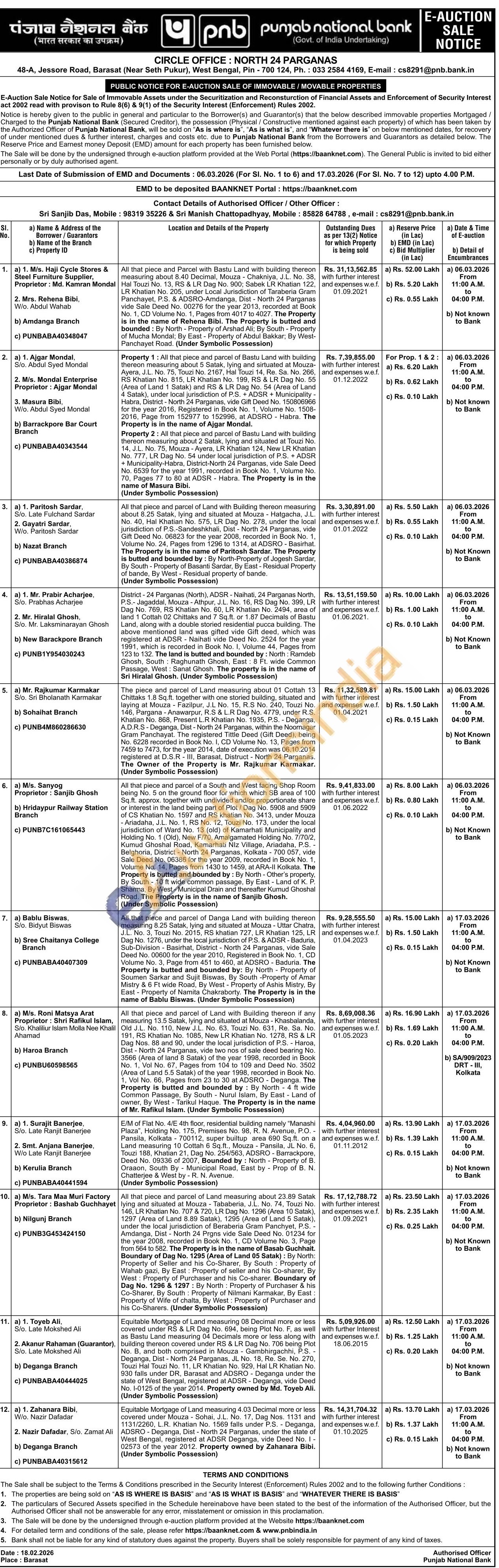 Sri Sanjib Das : 98319 35226 & Sri Manish Chattopadhyay : 85828 64788, e-mail: cs8291@pnb.bank.in