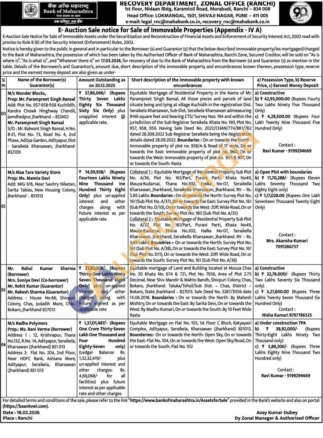 Equitable mortgage of Land and Building located at Mouza Chas No. 30 Khata No. 674 & 721, Plot No. 7656, Area of Plot 2.75 Decimal. Near Shiv Mandir & Mahto Bandh, Shivpuri Colony, Chas, Bokaro, Jharkhand. Taluka/Tehsil/Sub Dist. Chas, District Bokaro, State Jharkhand - 827013. Sale Deed No. 3287/3056 date 14.06.2018. Boundaries: On or towards the North: By Mahesh Mishtry, On or towards the East: By Sarita Devi, On or towards the West: By Madhu Kumari, On or towards the South: By 10 Feet Wide Rasta