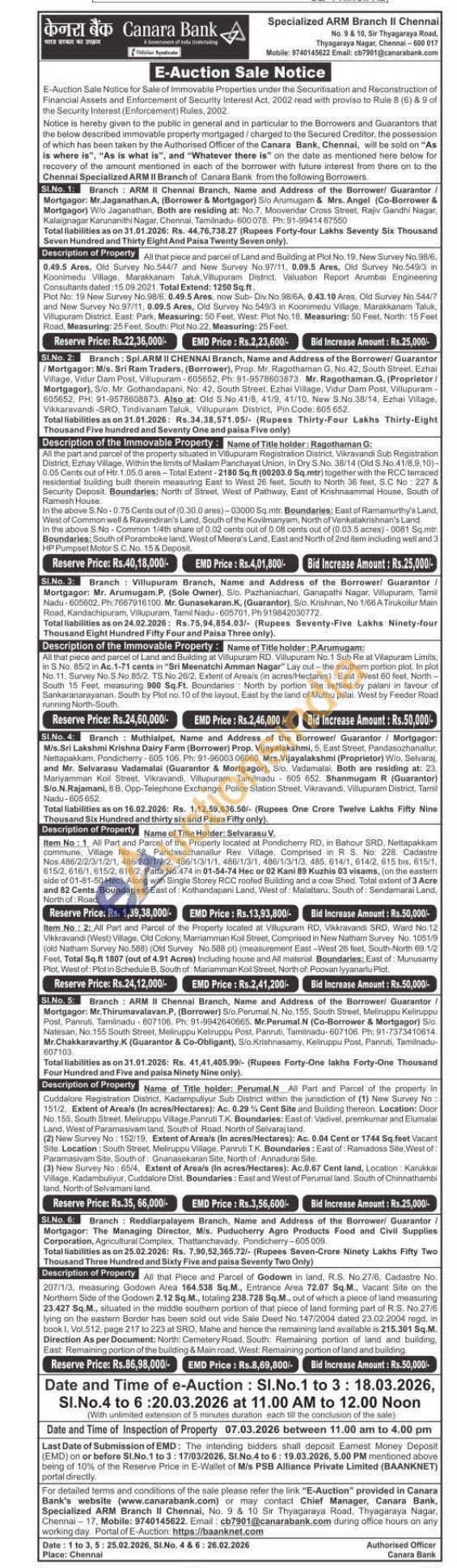 Name of Title holder: P.Arumugam: All that piece and parcel of Land and Building at Villupuram RD. Villupuram No.1 Sub Re at Vilapuram Limits, in S.No. 85/2 in Ac.1-71 cents in "Sri Meenatchi Amman Nagar" Lay out-the southern portion plot. In plot No. 11. Survey No. S.No. 85/2. TS. No 26/2, Extent of Area/s (in acres/Hectares): East-West 60 feet, North-South 15 Feet, measuring 900 Sq.Ft. Boundaries North by portion site settled by palani in favour of Sankaranarayanan. South by Plot no. 10 of the layout. East by the land of Muthu pillai. West by Feeder Road running North-South
