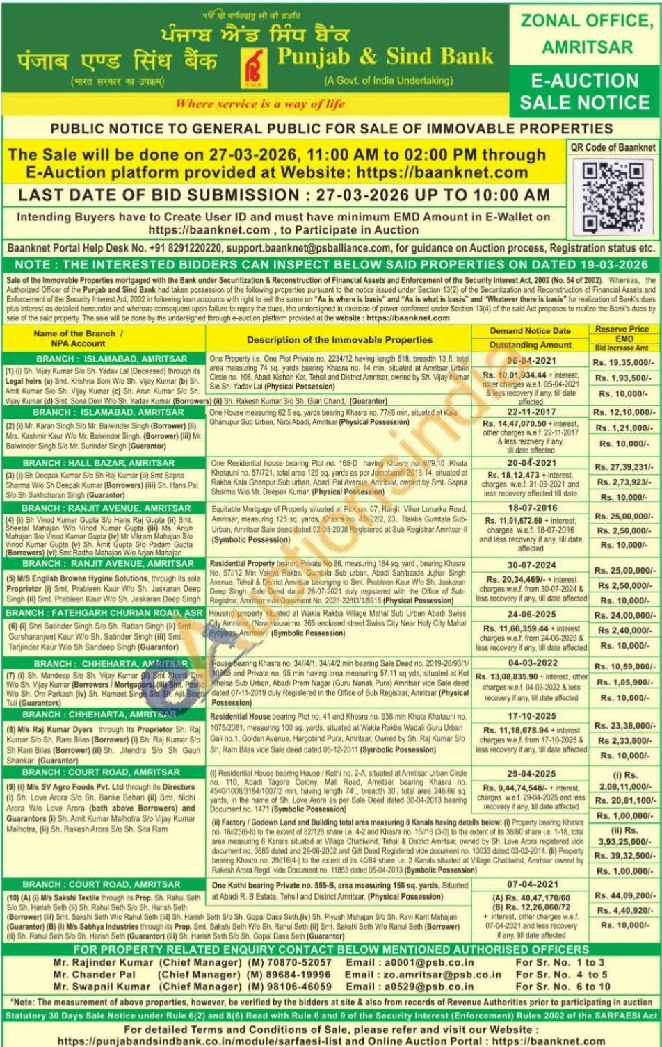 One Property ie. One Plot Private no. 2234/12 having length 51ft, breadth 13 ft, total area measuring 74 sq. yards bearing Khasra no. 14 min, situated at Amritsar Urban Circle no. 108, Abadi Kishan Kot, Tehsil and District Amritsar, owned by Sh. Vijay Kumar Sio Sh. Yadav Lal (Physical Possession)