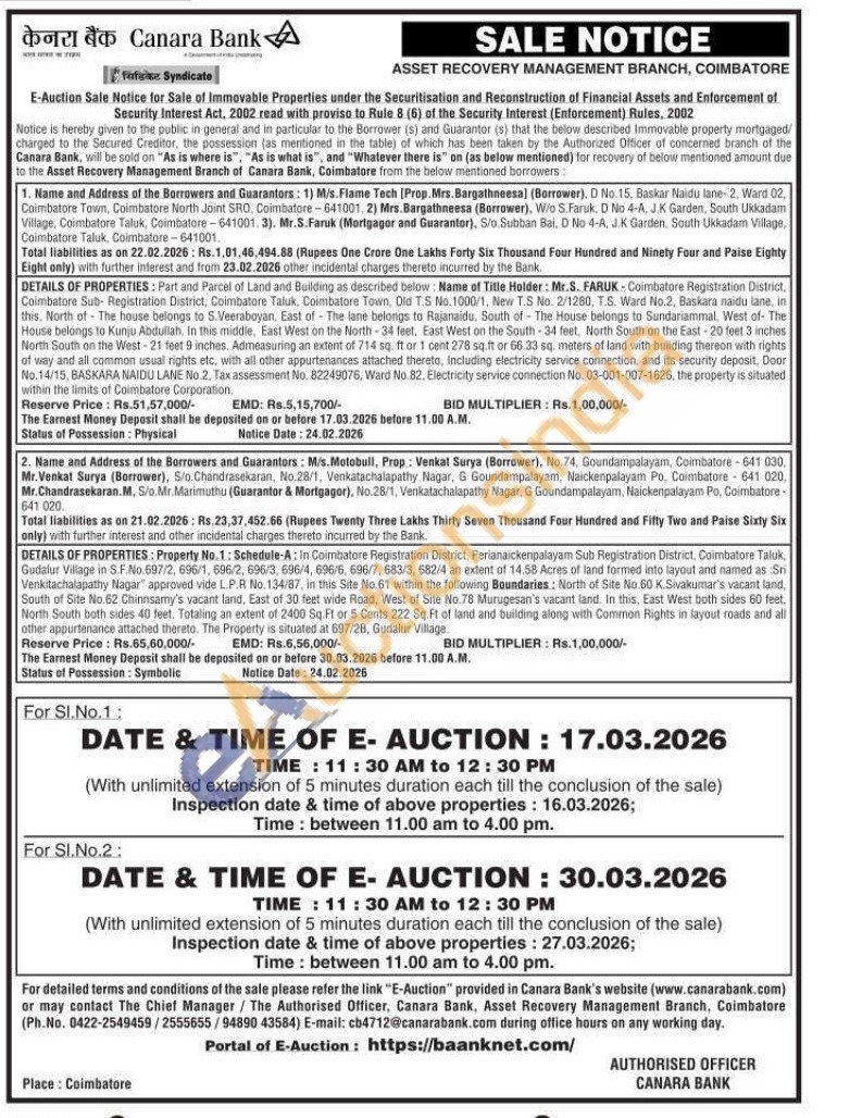 DETAILS OF PROPERTIES: Property No.1: Schedule-A: In Coimbatore Registration District, Perianaickenpalayam Sub Registration District, Coimbatore Taluk, Gudalur Village in SF.No.697/2, 696/1, 696/2, 696/3, 696/4, 696/6, 696/7, 683/3, 682/4 an extent of 14.58 Acres of land formed into layout and named as Sri Venkitachalapathy Nagar" approved vide L.P.R No.134/87, in this Site No.61 within the following Boundaries: North of Site No.60 K.Sivakumar's vacant land, South of Site No.62 Chinnsamy's vacant land, East of 30 feet wide Road, West of Site No.78 Murugesan's vacant land. In this, East West both sides 60 feet, North South both sides 40 feet. Totaling an extent of 2400 Sq Ft or 5 Cents 222 Sq.Ft of land and building along with Common Rights in layout roads and all other appurtenance attached thereto. The Property is situated at 697/28, Gudalur Village.