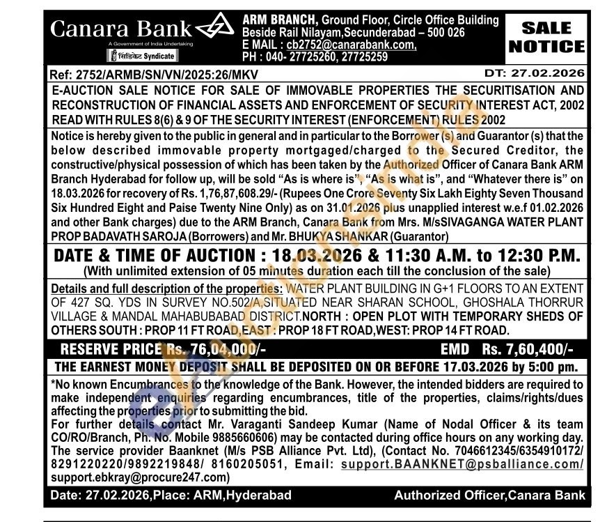Details and full description of the properties: WATER PLANT BUILDING IN G+1 FLOORS TO AN EXTENT OF 427 SQ. YDS IN SURVEY NO.502/A, SITUATED NEAR SHARAN SCHOOL, GHOSHALA THORRUR VILLAGE & MANDAL MAHABUBABAD DISTRICT.NORTH: OPEN PLOT WITH TEMPORARY SHEDS OF OTHERS SOUTH: PROP 11 FT ROAD, EAST: PROP 18 FT ROAD, WEST: PROP 14 FT ROAD