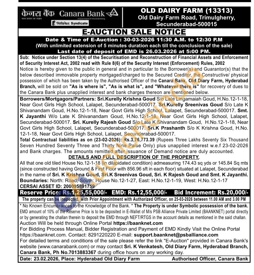 All that one old tiled House No. 12-1-18 (in dilapidated condition) admeasuring 174.43 sq yds or 145.84 Sq mts (since constructed having Ground & First Floor with 856.96 sft in each floor) situated at Lalapet, Secunderabad in the name of Sri. K Krishna Goud, Sri.K Sreenivas Goud, Sri. K Rajesh Goud and Smt. K Jayanthi. Boundaries: North: Road, South: House No. 12-1-27, East: H.No.12-1-19, West: H.No.12-1-17 CERSAI ASSET ID: 200095891759