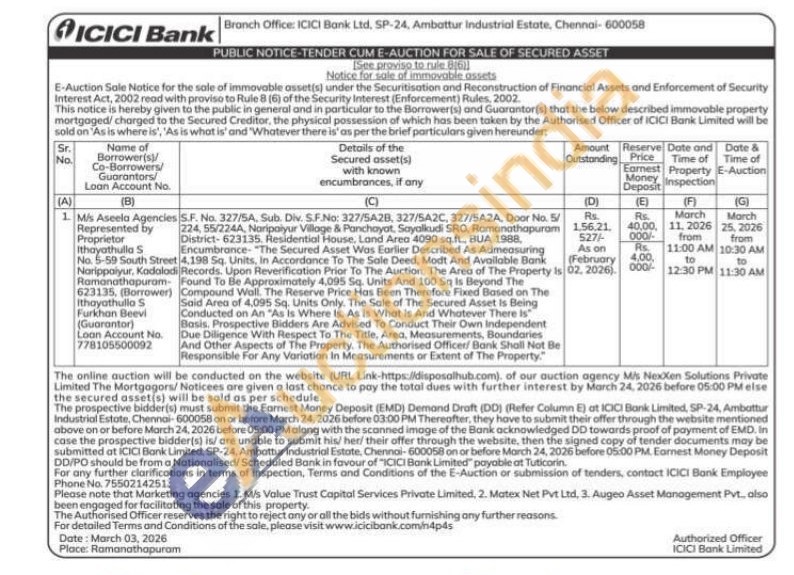 S.F. No. 327/5A, Sub. Div. S.F.No: 327/5A28, 327/5A2C, 327/5AZA, Door No. 5/224, 55/224A, Noripaiyur Village & Panchayat, Sayalkudi SRO, Romanathapuram District-623135. Residential House, Land Area 4090 sq.ft., BUA 1988, Encumbrance-"The Secured Asset Was Earlier Described As Admeasuring 4,198 Sq. Units, In Accordance To The Sale Deed, Modt And Available Bank Records. Upon Reverification Prior To The Auction. The Area of The Property is Found To Be Approximately 4,095 Sq. Units And 100 Sq is Beyond The Compound Wall. The Reserve Price Has Been Therefore Fixed Based on The Said Area of 4,095 Sq. Units Only. The Sale of The Secured Asset Is Being Conducted on An "As Is Where Is. As Is What is And Whatever There is Basis, Prospective Bidders Are Advised To Conduct Their Own Independent Due Diligence With Respect To The Title, Area, Measurements, Boundaries And Other Aspects of The Property. The Authorised Officer/ Bank Shall Not Be Responsible For Any Variation In Measurements or Extent of The Property.