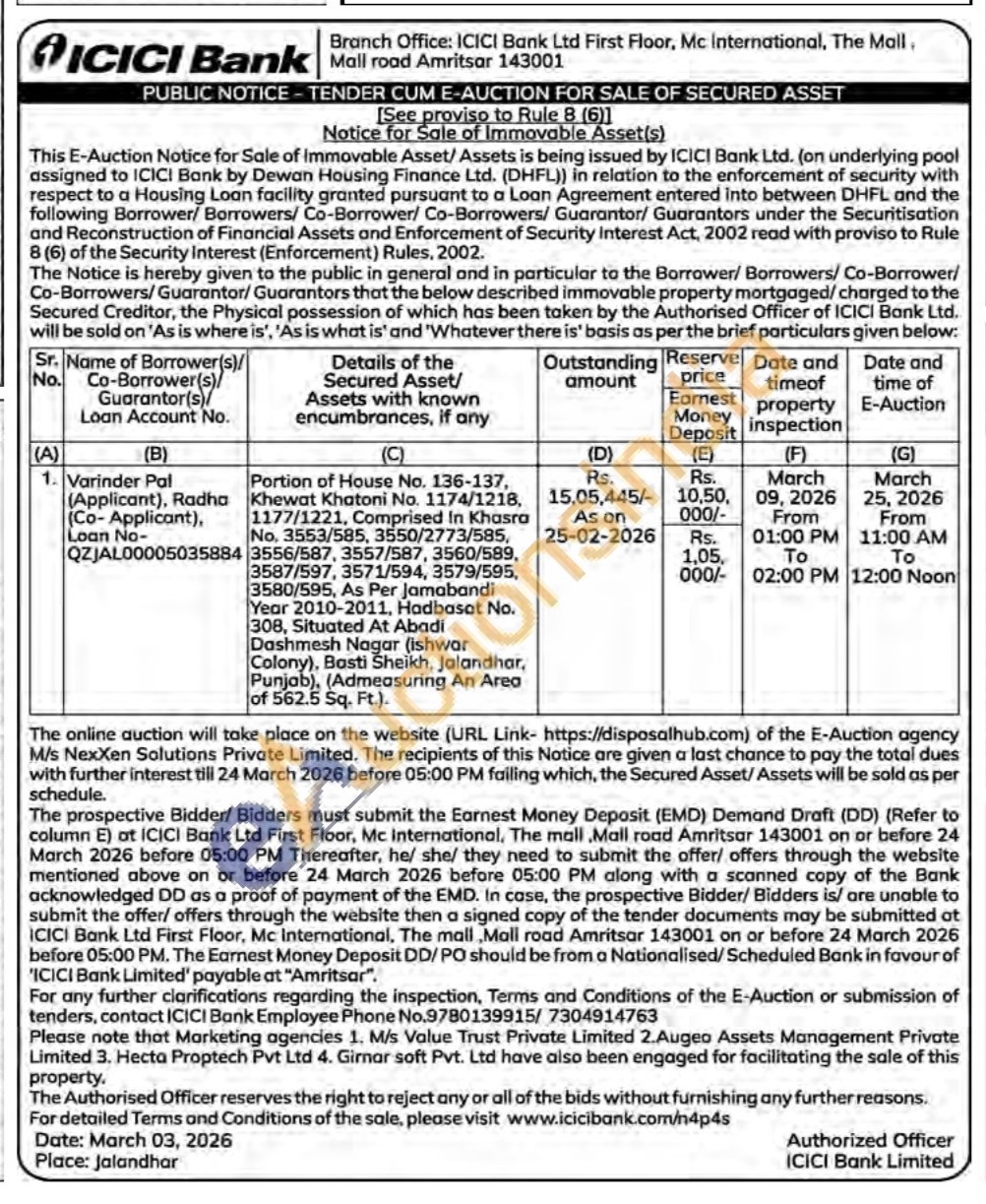 Portion of House No. 136-137, Khewat Khatoni No. 1174/1218, 1177/1221, Comprised In Khasra No. 3553/585, 3550/2773/585, 3556/587, 3557/587, 3560/589, 3587/597, 3571/594, 3579/595, 3580/595, As Per Jamabandi Year 2010-2011, Hadbasat No. 308, Situated At Abadi Dashmesh Nagar (ishwar Colony), Basti Sheikh, Jalandhar, Punjab), (Admeasuring An Area of 562.5 Sq. Ft.).