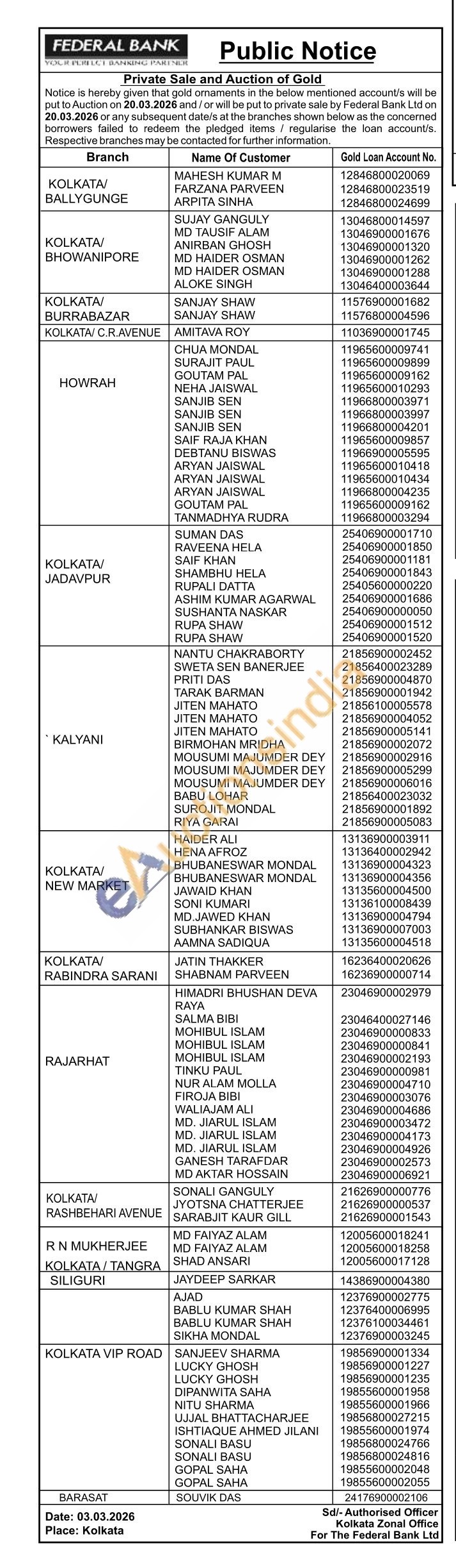 Federal Bank Gold Auctions Auction in Kolkata
