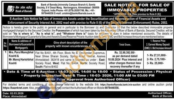 Flat No B/401, 4th Floor, Block No B, Devnandan Supremus, Near Shree Sharan Society, Spring Road, Vastral, Asarwa Ahmedabad-382418 and same is bounded as under: East : Society Road, West: Flat No. B/404, North: Society Road, South: Flat no B/402