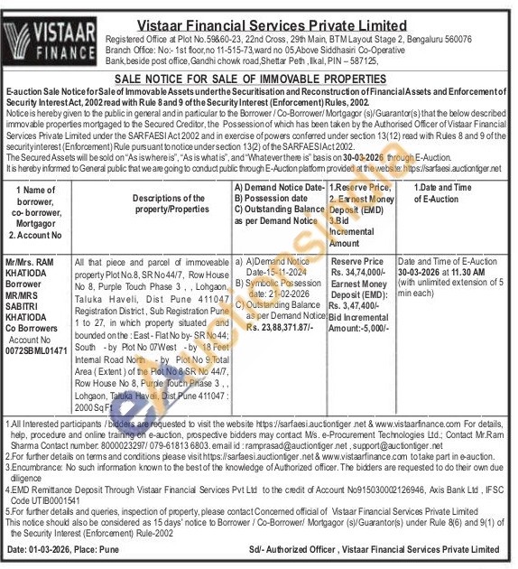 All that piece and parcel of immoveable property Plot No. 8, SR No44/7, Row House No 8, Purple Touch Phase 3, Lohgaon, Taluka Haveli, Dist Pune 411047 Registration District, Sub Registration Pune 1 to 27, in which property situated and bounded on the East-Fiat No by SR No44; South by Plot No 07West -by 18 Feet Internal Road North by Plot No 9. Total Area (Extent) of the Plot No 8 SR No 44/7, Row House No 8, Purple Touch Phase 3,. Lohgaon, Taluka Haveli, Dist Pune 411047: 2000 Sq Ft
