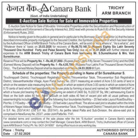 Tiruchirappalli District, Tiruchirappalli Registration District, Thiruverambur Taluk, Thiruverambur Sub Registration District, Valavanthankottai Village, Ayan Punja Survey No. 253/1 measuring an extent of Acre 5.53 cents of land in which on the western side measuring Acre 4.05 cents in which an extent of Acre 3.00 cents in which an extent of Acre 0.75 cents of land which had beendivided into house plots by forming a layout and named as "ABIRAMI NAGAR", in which a house plot bearing Plot No. C12 measuring an extent of 2400 Sq. ft. (222.97 Sq. Mtr.) admeasuring East to West on the both sides 60 feet, North to South on both sides 40 feet of vacant plot with all usual pathway and easementrights including thereon within the following four boundaries:Northby-20 feet wide Layout RoadSouthby-Plot No. C11Eastby-Plot No. D12Westby-20 feet wide Layout Road. The above said plot is situated within the limits of Abirami Nagar, Valavanthankottai Village, Thiruverambur Taluk, Tiruchirappalli District. Thesaid plot is then situated in S.F. No. 253/1A1A1 (Old S.F. No. 253/1A1). As perthe latest Patta and Sub-Division, the above-said plot is comprised in NewSurvey No. 253/7, under Joint Patta No. 1141
