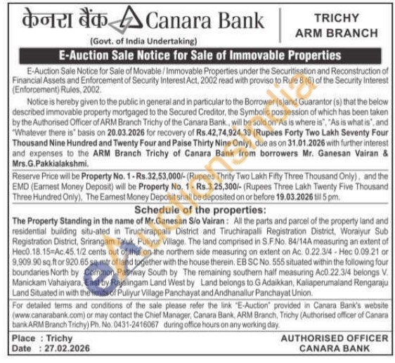 Schedule of the properties: The Property Standing in the name of Mr.Ganesan Sio Vairan: All the parts and parcel of the property land and residential building situ-ated in Tiruchirappalli District and Tiruchirapalli Registration District, Woraiyur Sub Registration District, Srirangam Taluk, Puliyur Village. The land comprised in S.F.No. 84/14A measuring an extent of Hec0.18.15-Ac 45.1/2 cents out of this on the northern side measuring on extent on Ac. 0.22.3/4-Hec 0.09.21 or 9,909.90 sq.ft or 920.65 sq.mtr of land together with the house therein. EB SC No. 555 situated within the following four boundaries North by Common Pathway South by The remaining southem half measuring Ac0.22.3/4 belongs V. Manickam Vahaiyara, East by Rajalingam Land West by Land belongs to G Adaikkan, Kaliaperumaland Rengaraju Land Situated in with the limits of Puliyur Village Panchayat and Andhanallur Panchayat Union
