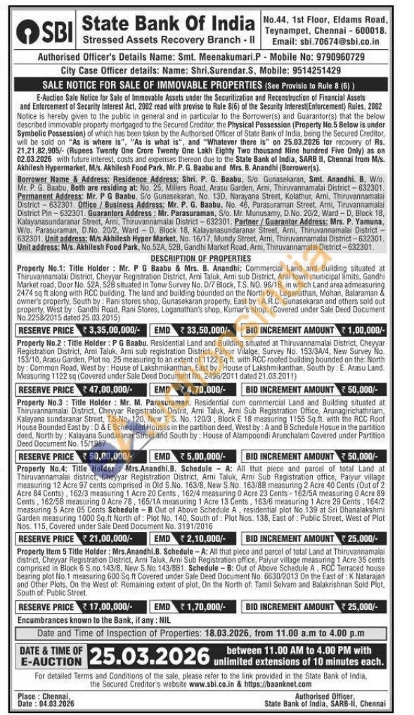 1) Commercial Land and Building situated at Thiruvannamalai District, Cheyyar Registration District, Arni Taluk, Arni sub District, Arni town municipal limits, Gandhi Market road, Door No. 52A, 528 situated in Tonw Survey No. D/7 Block, T.S. NO. 96/18, in which Land area admeasuring 2474 sq ft along with RCC building. The land and building bounded on the North by: Loganathan, Mohan, Balaraman & owner's property, South by: Rani stores shop, Gunasekaran property, East by A.R.C. Gunasekaran and others sold out property, West by Gandhi Road, Rani Stores, Loganathan's shop, Kumar's shop. (Covered under Sale Deed Document No.2258/2015 dated 25.03.2015)