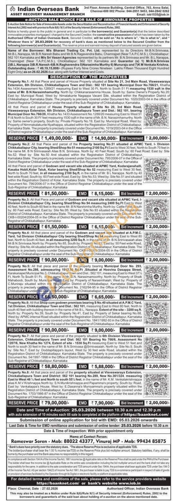 Property No.4: All that piece and parcel of the Godown and vacant site situated at A.P.M.C. Yard, 1st Division Chikkaballapur City bearing Shed/Shop No 64 measuring East to West 80 feet, North to South 40 feet, in all measuring 3200 Sq.ft. in the name of Mr. B.N.Srinivasaiah alias Mr.B.N.Srinivasa. North by: Property No.65, South by: Property No. 63, East by: 50 Feet wide Road, West by: Site No. 44 situated within the Registration District of Chikkaballapur, Karnataka State. The property is precisely covered under Document No. CKB-1-00203/2004-05 in the Office of District Registrar Chikkaballapur under the seal of the Sub-Registrar of Chikkaballapur, Kamataka