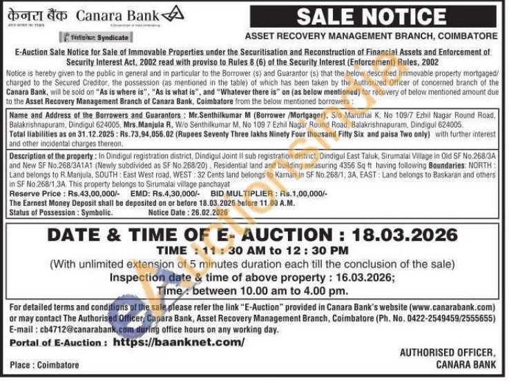 Description of the property: In Dindigul registration district, Dindigul Joint Il sub registration district, Dindigul East Taluk, Sirumalai Village in Old SF No.268/3A and New SF No.268/3A1A1 (Newly subdivided as SF No.268/20), Residential land and building measuring 4356 Sq ft having following Boundaries: NORTH: Land belongs to R.Manjula, SOUTH: East West road, WEST: 32 Cents land belongs to Kaman in SF No 268/1, 3A, EAST: Land belongs to Baskaran and others in SF No.268/1,3A. This property belongs to Sirumalai village panchayat