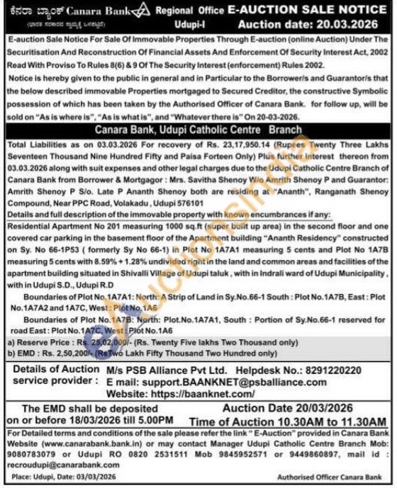 Details and full description of the immovable property with known encumbrances if any: Residential Apartment No 201 measuring 1000 sq.ft (super built up area) in the second floor and one covered car parking in the basement floor of the Apartment building "Ananth Residency" constructed on Sy. No 66-1P53 (formerly Sy No 66-1) in Plot No 1A7A1 measuring 5 cents and Plot No 1A7B measuring 5 cents with 8.59% +1.28% undivided right in the land and common areas and facilities of the apartment building situated in Shivalli Village of Udupi taluk, with in Indrali ward of Udupi Municipality, with in Udupi S.D., Udupi R.D