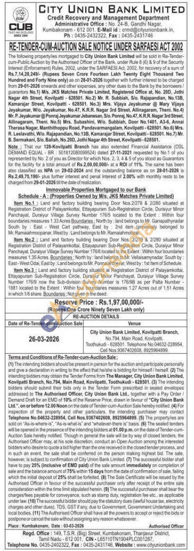 Item No.1: Land and factory building bearing Door Nos 2/279 & 2/280 situated at Registration District of Palayamkottai, Ettayapuram Sub-Registration Circle, Duraiyur Minor Panchayat, Duraiyur Village Survey Number 176/5 located to the Extent: Within four boundaries measures 1.33 Acres Boundaries: North by: land belongs to Mr. Ganapathynadar South by East West Cart pathway. East by 2nd item (previously belonged to Mr. Ramaiahmoopanar, West by: Land belongs to Mr. Ramalahmoopar.