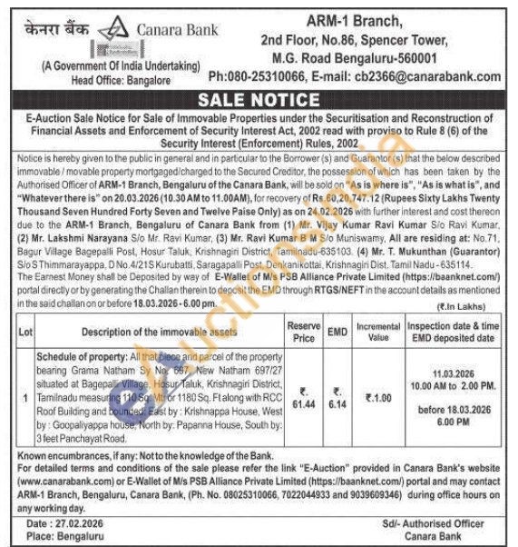 Schedule of property: All that piece and parcel of the property bearing Grama Natham Sy No. 697, New Natham 697/27 situated at Bagepali Village, Hosur Taluk, Krishnagiri District, 1 Tamilnadu measuring 110 Sq. Mtr or 1180 Sq. Ftalong with RCC Roof Building and bounded: East by: Krishnappa House, West by Goopaliyappa house, North by. Papanna House, South by: 3 feet Panchayat Road.