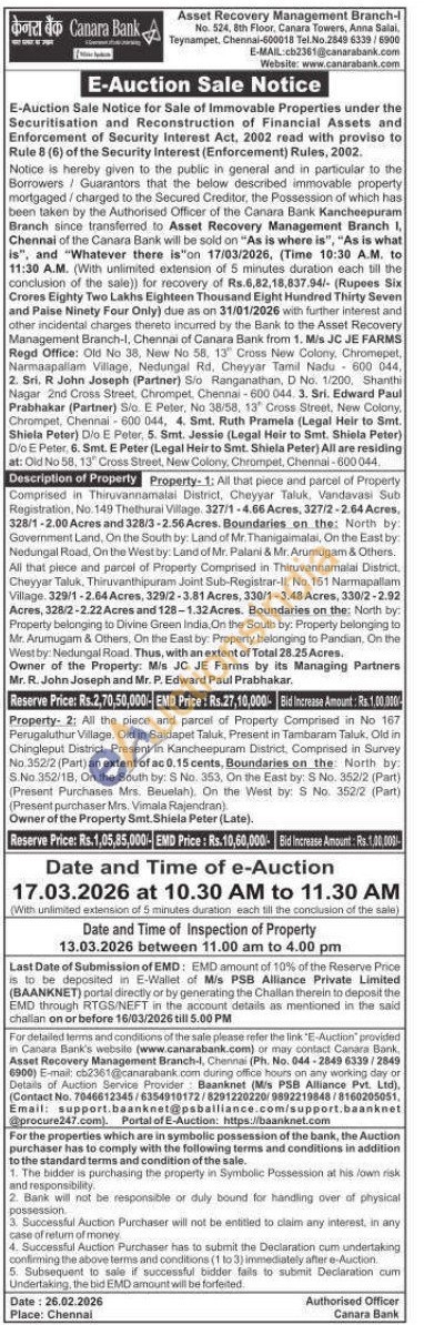 Property-1: All that piece and parcel of Property Comprised in Thiruvannamalai District, Cheyyar Taluk, Vandavasi Sub Registration, No. 149 Thethurai Village 327/1-4.66 Acres, 327/2-2.64 Acres, 328/1-2.00 Acres and 328/3-2.56 Acres. Boundaries on the: North by: Government Land, On the South by: Land of Mr. Thanigaimalai, On the East by: Nedungal Road, On the West by: Land of Mr. Palani & Mr. Arumugam & Others. All that piece and parcel of Property Comprised in Thiruvannamalai District. Cheyyar Taluk. Thiruvanthipuram Joint Sub-Registrar-II, No. 151 Narmapallam Village. 329/1-2.64 Acres, 329/2-3.81 Acres, 330/1-3.48 Acres, 330/2-2.92 Acres, 328/2-2.22 Acres and 128-1.32 Acres. Boundaries on the: North by: Property belonging to Divine Green India On the South by: Property belonging to Mr. Arumugam & Others, On the East by: Property belonging to Pandian. On the West by: Nedungal Road. Thus, with an extent of Total 28.25 Acres