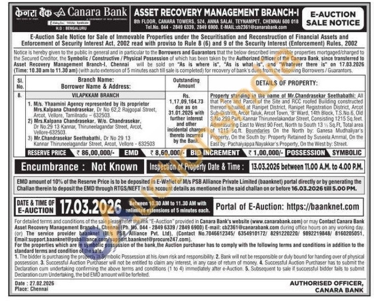 Property standing in the name of Mr.Chandrasekar Seethabathi: All that Piece and Parcel of the Site and RCC roofed Building constructed thereon situated at Ranipet District, Ranipet Registration District, Arcot Sub-District, Arcot Taluk, Arcot Town, "B" Ward, 14th Block, T.S.No.6, Old S.No.299 Part, Kannar Thiruneelakandar Street, Consisting 1215 Sq. feet Admeasuring East to West 90 Feet, North to South 13 Sq. Ft, Total area of 1215 sq.ft. Boundaries On the North by: Ganesa Mudhaliyar's Property, On the South by: Property Retained by Suseela Ammal, On the East by: Pachaiyappa Nayakkar's Property, On the West by: Street.