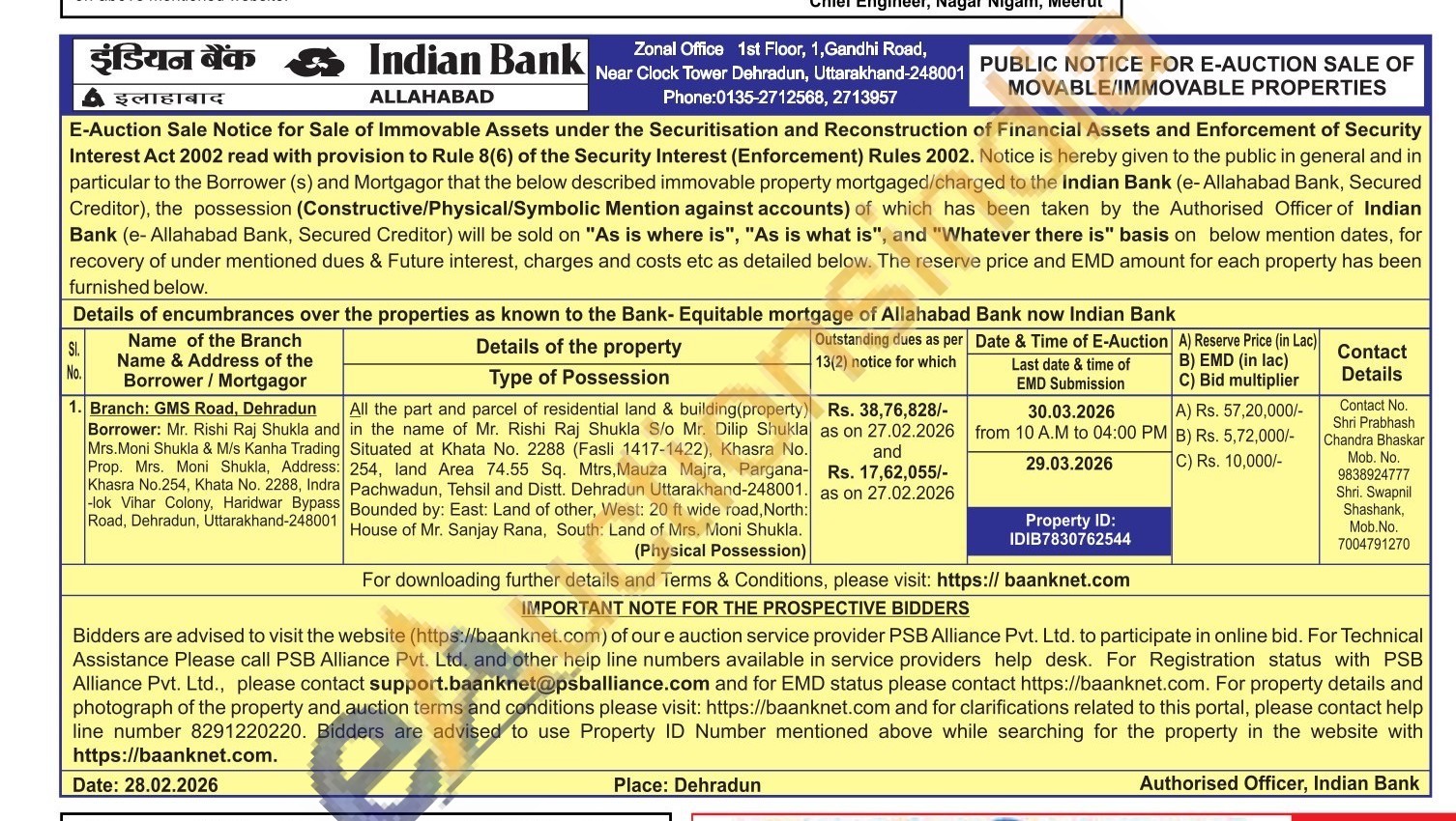 All the part and parcel of residential land & building(property) in the name of Mr. Rishi Raj Shukla S/o Mr. Dilip Shukla Situated at Khata No. 2288 (Fasli 1417-1422), Khasra No. 254, land Area 74.55 Sq. Mtrs, Mauza Majra, Pargana-Pachwadun, Tehsil and Distt. Dehradun Uttarakhand-248001. Bounded by: East: Land of other, West: 20 ft wide road, North: House of Mr. Sanjay Rana, South: Land of Mrs. Moni Shukla.