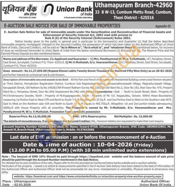 Description of immovable secured assets to be Sold: All the Part and Parcel of the Land with Residential Building constructed thereon situated at Theni District, Periyakulam Registration District, Cumbum Sub Registration District, Narayanathevanpatti Village, MajaraSurulipatti Village, Karuppaiah Street, Old Natham Sy.No. 140281399 Present Natham Survey No. 2281/24 Old Ward No.2, Door No. 183, then Door No. 475, Present Ward No.1, Periyarasu Street, Door No.204( Assessment No.540) with following boundaries: East: North to South Street, West: Property of Mr.V.Krishnasamy Gowder, North: Property of Mr.Esappagowder, South Property of Mr. V.S. Nagasubbu, Deivam. Within these Boundaries measuring 1st Portion East to West 27ft and North to South 7 ft Equals to 202.25 Sq.ft and 2nd Portion East to West on the Southern side 40 ft, East to West on the Northern side 41ft and North to South 11 Va ft Equals to 465.75Sq.ft. Altogether 1st and 2nd portion totally admeasuring 6685q.ft with House Property with all amenities. The Property is owned by Mr. V.Muthaiah, S/o. Veerananthevar and Mrs. Pandiyammal M, W/o. V.Muthaiah