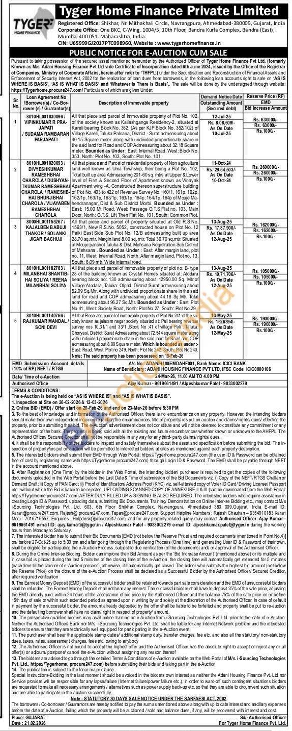 All that piece and parcel of immovable property of plat no. E- type 28 of the building known as Crystal Homes situated at: Alodara bearing block no: 130 admeasuring about 12950.00 Sq. Mtr.of Village Atodara, Taluka: Olpad, District:Surat admeasuring about 52.09 Sq. Mir. Along with undivided proportionate share in the said land for road and COP admeasuring about 44.18 Sq.Mtr. Total admeasuring about 96.27 Sq.Mtr. Bounded as Under: East: Plot No.41. West: Society Road, North: Plot No. 27, South: Plat No.29