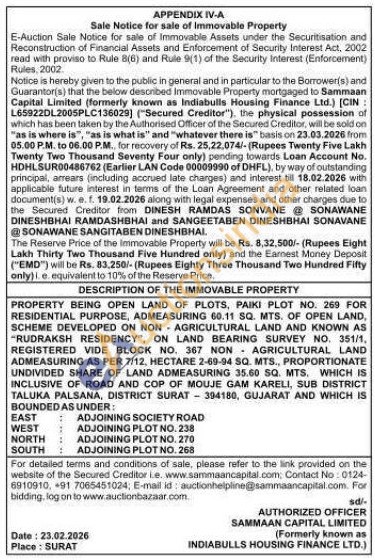 DESCRIPTION OF THE IMMOVABLE PROPERTY : PROPERTY BEING OPEN LAND OF PLOTS, PAIKI PLOT NO. 269 FOR RESIDENTIAL PURPOSE, ADMEASURING 60.11 SQ. MTS. OF OPEN LAND, SCHEME DEVELOPED ON NON AGRICULTURAL LAND AND KNOWN AS -RUDRAKSH RESIDENCY, ON LAND BEARING SURVEY NO. 351/1, REGISTERED VIDE BLOCK NO. 367 NON AGRICULTURAL LAND ADMEASURING AS PER 7/12, HECTARE 2-69-94 SQ. MTS., PROPORTIONATE UNDIVIDED SHARE OF LAND ADMEASURING 35.60 SQ. MTS, WHICH IS INCLUSIVE OF ROAD AND COP OF MOUJE GAM KARELI, SUB DISTRICT TALUKA PALSANA, DISTRICT SURAT 394180, GUJARAT AND WHICH IS BOUNDED AS UNDER: