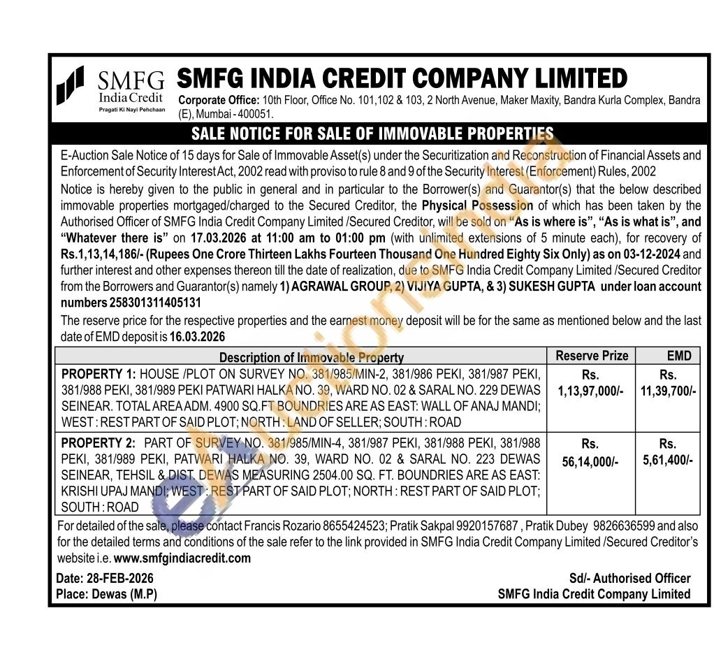 PROPERTY 2: PART OF SURVEY NO. 381/985/MIN-4, 381/987 PEKI, 381/988 PEKI, 381/988 PEKI, 381/989 PEKI, PATWARI HALKA NO. 39, WARD NO. 02 & SARAL NO. 223 DEWAS SEINEAR, TEHSIL & DIST. DEWAS MEASURING 2504.00 SQ. FT. BOUNDRIES ARE AS EAST: KRISHI UPAJ MANDI; WEST: REST PART OF SAID PLOT; NORTH: REST PART OF SAID PLOT; SOUTH: ROAD