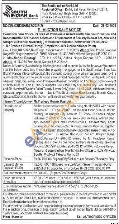 All that piece and parcel of Flat bearing No 111A/354 with having an area of 117,054 sq.mtr, on the first Floor of multi storied building at Kanpur City area at SR Zone -2, Kanpur Nagar, inclusive of rights in common areas and facilities, with all other appurtenant rights over constructions, easementary rights existing or to be constructed & improvements thereon, together with 31.43 sq mtr of proportionate undivided share of land out of 139.62 sq.mtr in Ashok Nagar, SR Zone-2, Kanpur Nagar District.Kanpur U.P-208012 owned by Mr Pradeep Kumar Rastogi and morefully described in the Sale deed registered as Doc No: 5695/2012. Dated 20-09-2012 of SRO-Zone-2 Kanpur Nagar and bounded on North: Plot No.33 East: 6.09 Mtr Road South: Plot No.31 West: Plot no.27
