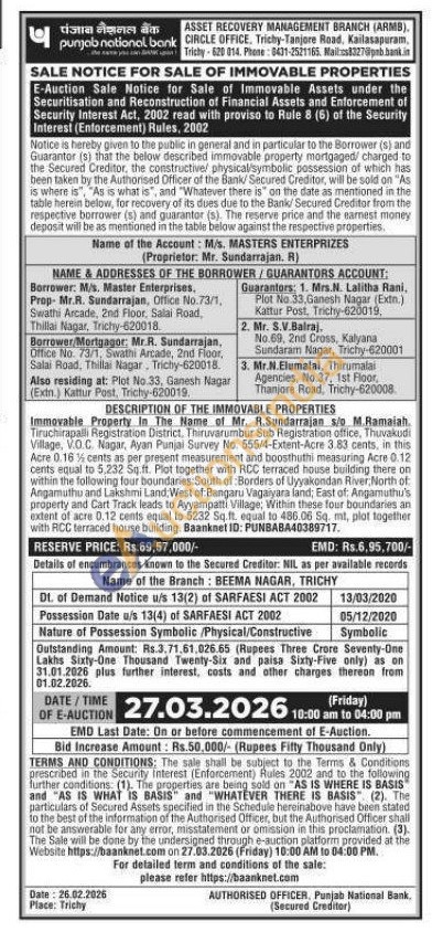 Tiruchirapalli Registration District, Thiruvarumbur Sub Registration office, Thuvakudi Village, VO.C. Nagar, Ayan Punjal Survey No. 555/4-Extent-Acre 3.83 cents, in this Acre 0.16% cents as per present measurement and boosthuthi measuring Acre 0.12 cents equal to 5.232 Sq.ft. Plot together with RCC terraced house building there on within the following four boundaries: South of Borders of Uyyakondan River North of Angamuthu and Lakshmi Land, West of Bangaru Vagaiyara land; East of Angamuthu's property and Cart Track leads to Ayyampatti Village; Within these four boundaries an extent of acre 0.12 cents equal to 5232 Sq.ft. equal to 486.06 Sq. mt, plot together with RCC terraced house building. Baanknet ID: PUNBABA40389717.