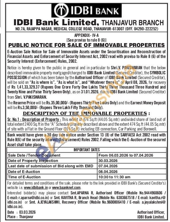 Sr. No.1: Description of Property: This extent of 474 Sq.ft (44.05 Sq.mtr) undivided share of land out of total extent 2400 Sq.ft in the "A" Schedule property described above and the extent 474 Sq.ft (44.05 Sq.mtr) of site with a Flat in the Ground Floor (919 Sq.ft) including EB connection, Car Parking and Borewell.