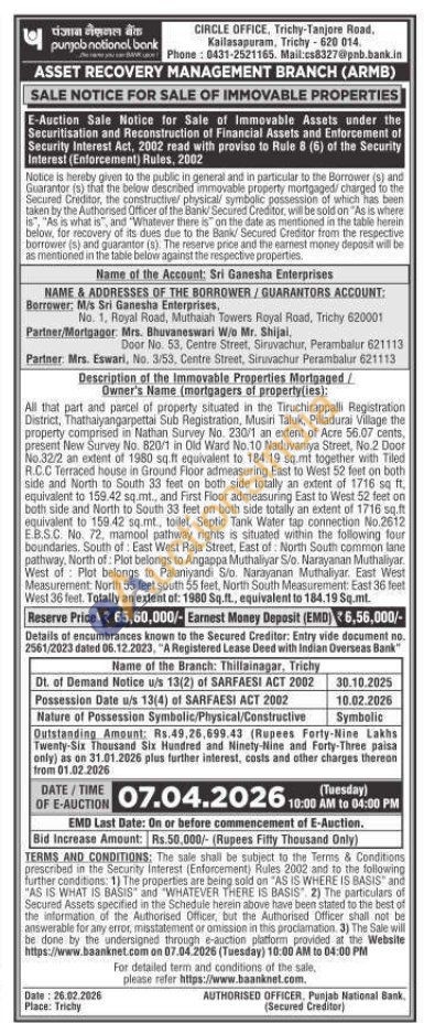 All that part and parcel of property situated in the Tiruchirappalli Registration District, Thathaiyangarpettai Sub Registration, Musiri Taluk, Pilladurai Village the property comprised in Nathan Survey No. 230/1 an extent of Acre 56.07 cents, present New Survey No. 820/1 in Old Ward No.10 Naduvaniya Street, No.2 Door No.32/2 an extent of 1980 sq.ft equivalent to 184.19 sq.mt together with Tiled R.C.C Terraced house in Ground Floor admeasuring East to West 52 feet on both side and North to South 33 feet on both side totally an extent of 1716 sq ft, equivalent to 159.42 sq.mt., and First Floor admeasuring East to West 52 feet on both side and North to South 33 feet on both side totally an extent of 1716 sq.ft equivalent to 159 42 sq.mt., toilet, Septic Tank Water tap connection No.2612 E.B.SC. No. 72, mamool pathway rights is situated within the following four boundaries. South of East West Raja Street, East of North South common lane pathway, North of Plot belongs to Angappa Muthaliyar S/o. Narayanan Muthaliyar. West of Plat belongs to Palanivandi Sio. Narayanan Muthaliyar. East West Measurement: North 55 feet south 55 feet, North South Measurement: East 36 feet West 36 feet. Totally an extent of: 1980 Sq.ft, equivalent to 184.19 Sq.mt.