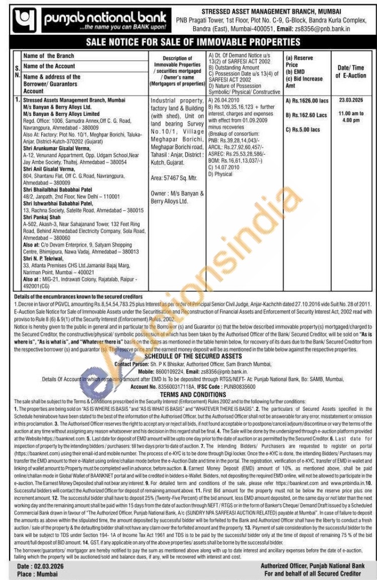 Industrial property, factory land & Building (with shed). Unit on land bearing Survey No. 10/1, Village Meghapar Borichi, Meghapar Borichi road, Tahasil: Anjar, District: Kutch, Gujarat.Area: 57467 Sq. Mtr. Owner: M/s Banyan & Berry Alloys Ltd.