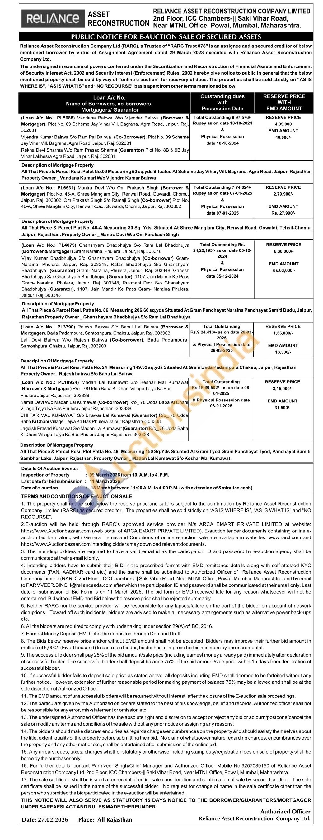 All That Piece & Parcel Resi. Palot No.09 Measuring 50 sq.yds Situated At Scheme Jay Vihar, Vill. Bagrana, Agra Road, Jaipur, Rajasthan Property Owner_Vandana Kumari W/o Vijendra Kumar Bairwa