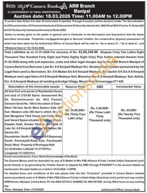 All that Part and parcel of Residential House and land of 2724.80 Sqmtr. Assessment No 85, Khaneshmumari No. 66/2 Present Demand Serial No. 106 to the extent of East-West 140 feet, North West Eastern Side 163 feet, Western side 256 feet in which 36 x 44 feet Mangalore Tiled House and Cattle Shed and Vacant Space situated at Andige Village, Kasaba Hobli, Soraba Taluk in the name of Late. Sri. AS Kenjodi Wadeyar, Mr. Madan, Mr. Sachin SK.