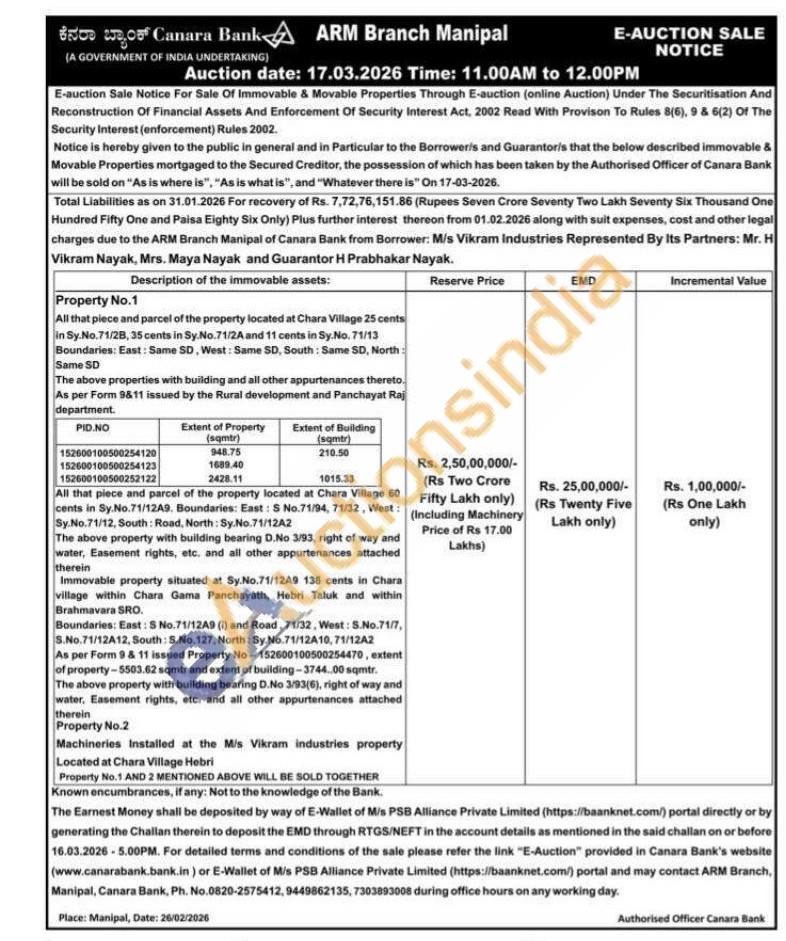 All that piece and parcel of the property located at Chara Village 60 cents in Sy.No. 71/12A9. Boundaries: East: S No.71/94, 71/32, West: Sy.No. 71/12, South: Road, North: Sy No.71/12A2 The above property with building bearing D.No 3/93, right of way and water, Easement rights, etc. and all other appurtenances attached therein Immovable property situated at Sy. No.71/1249 136 cents in Chara village within Chara Gama Panchayath, Hebri Taluk and within Brahmavara SRO. Boundaries: East: S No.71/1249 (1) and Road, 71/32, West: S.No.71/7, S.No. 71/12A12, South: 5.No.127, North: Sy.No. 71/12A10, 71/12A2 As per Form 9 & 11 issued Property No-152600100500254470, extent of property-5503.62 sqmtr and extent of building-3744.00 sqmtr. The above property with building bearing D.No 3/93(6), right of way and water, Easement rights, etc. and all other appurtenances attached therein Property No.2 Machineries Installed at the Mis Vikram industries property Located at Chara Village Hebri