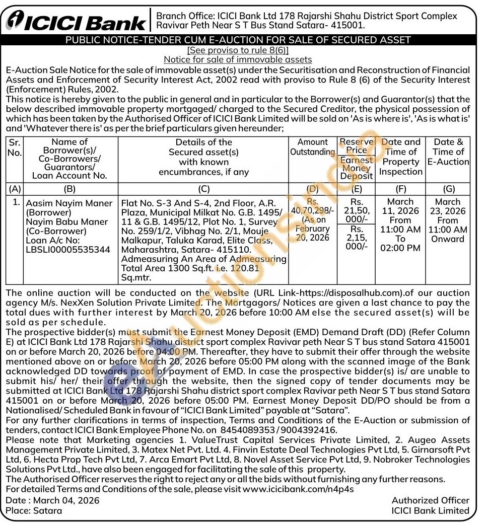 Flat No. S-3 And S-4, 2nd Floor, A.R. Plaza, Municipal Milkat No. G.B. 1495/11 & G.B. 1495/12, Plot No. 1, Survey No. 259/1/2, Vibhag No. 2/1, Mouje Malkapur, Taluka Karad, Elite Class, Maharashtra, Satara-415110. Admeasuring An Area of Admeasuring Total Area 1300 Sq.ft. i.e. 120.81 Sq.mtr