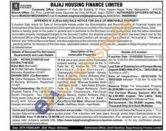 All that piece and parcel of the immovable property bearing and bounded on the: 1. Patta No. 45. Khasra No. 379, Vilage Ranikpura, Gram Panchayat Chamanpura, Panchayat Samis Banera, Tehsil & Banera. District Bhilwara (Raj.) 311401Admeasuring 105.6 Sq. Yd East Aam Rast. West: Shanwar Suwalka. North Self Bara South Aam Rasta. 2.House. Patta no 27. Village Ranikpura, Gram Panchayat Chamanpura, Panchayat Samiti Banera, District Bhilwara (Raj.) Admeasuring 255.2 Sq. Yd. East: Kana Barda Maxi West: -Bhanwar Suwalka. North: -Self Bara, South Aam Rasta